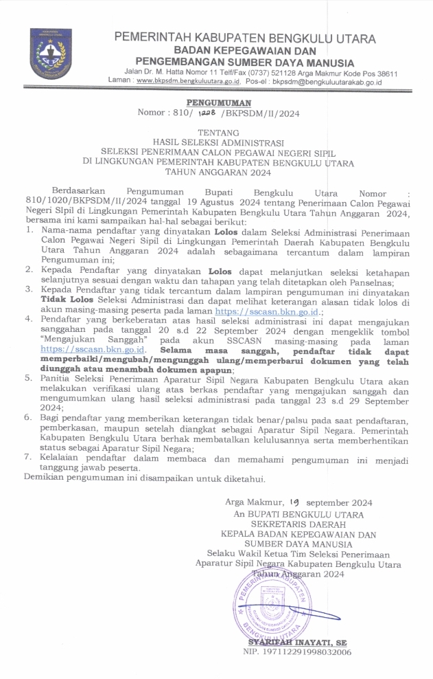 Suarokito Com – Secara resmi, Pemkab Bengkulu Utara melalui Badan Kepegawaian dan Pengembangan Sumber Daya Manusia (BKPSDM) Kabupaten Bengkulu Utara secara update telah mengumumkan tahapan seleksi penerimaan Calon Pegawai Negeri Sipil (CPNS) tahun 2024.