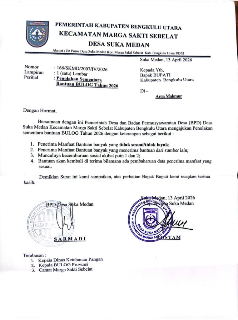 Suarokito.com – Kebijakan tak lazim diambil Pemerintah Desa Suka Medan, Kecamatan Marga Sakti Sebelat, Kabupaten Bengkulu Utara. Melalui surat resmi tertanggal 13 April 2026, desa tersebut secara tegas menolak sementara penyaluran bantuan Bulog tahun 2026.