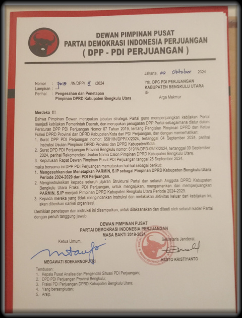 Dimana dalam surat tersebut DPP PDIP mengesahkan dan menetapkan Parmin,S.IP sebagai pimpinan DPRD kabupaten Bengkulu Utara periode 2024-2029 dari PDI Perjuangan.