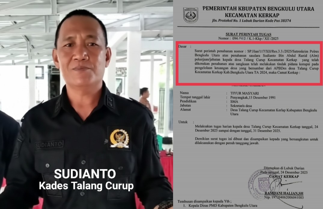 Dimana didalam surat perintah tugas yang dikeluarkan oleh Camat dengan nomor : 094/459/K.1-Kkp/XII/2025 yang ditetapkan pada tanggal 24 Desember 2025 dan ditanda tangani oleh Camat Kerkap Ramdani Halian, SH. tertera jelas dasar acuan tersebut adanya surat perintah penahanan nomor : SP.Han/117/XII/Res.3.3/2025 dari Satreskrim Polres Bengkulu Utara atas penahanan saudara Sudianto Bin Abdul Ranid (Alm) jabatan Kepala Desa Talang Curup Kecamatan Kerkap yang telah dikenakan penahanan atas sangkaan telah melakukan tindak pidana korupsi pada pengelolaan keuangan desa yang bersumber dari APBDes Desa Talang Curup tahun anggaran 2024.