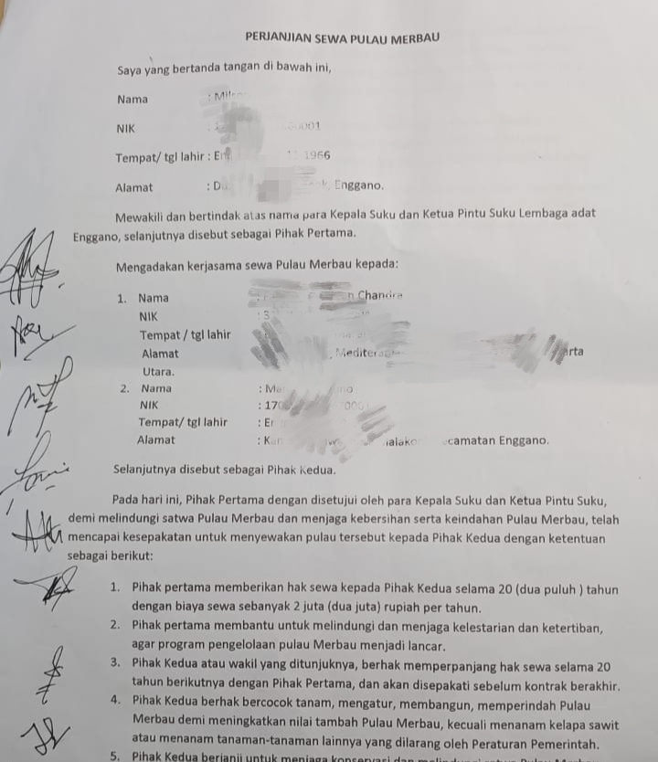 Sebelumnya, Pulau Merbau Enggano seluas sekitar 6,8 Hektare (0,068 km²) yang disewakan oleh pihak yang mengatasnamakan Lembaga Adat Enggano selama 20 tahun dengan sewa pertahunnya sebesar Rp. 2 juta, ternyata telah dibayarkan lunas oleh pihak ketiga sebesar Rp. 40 juta.